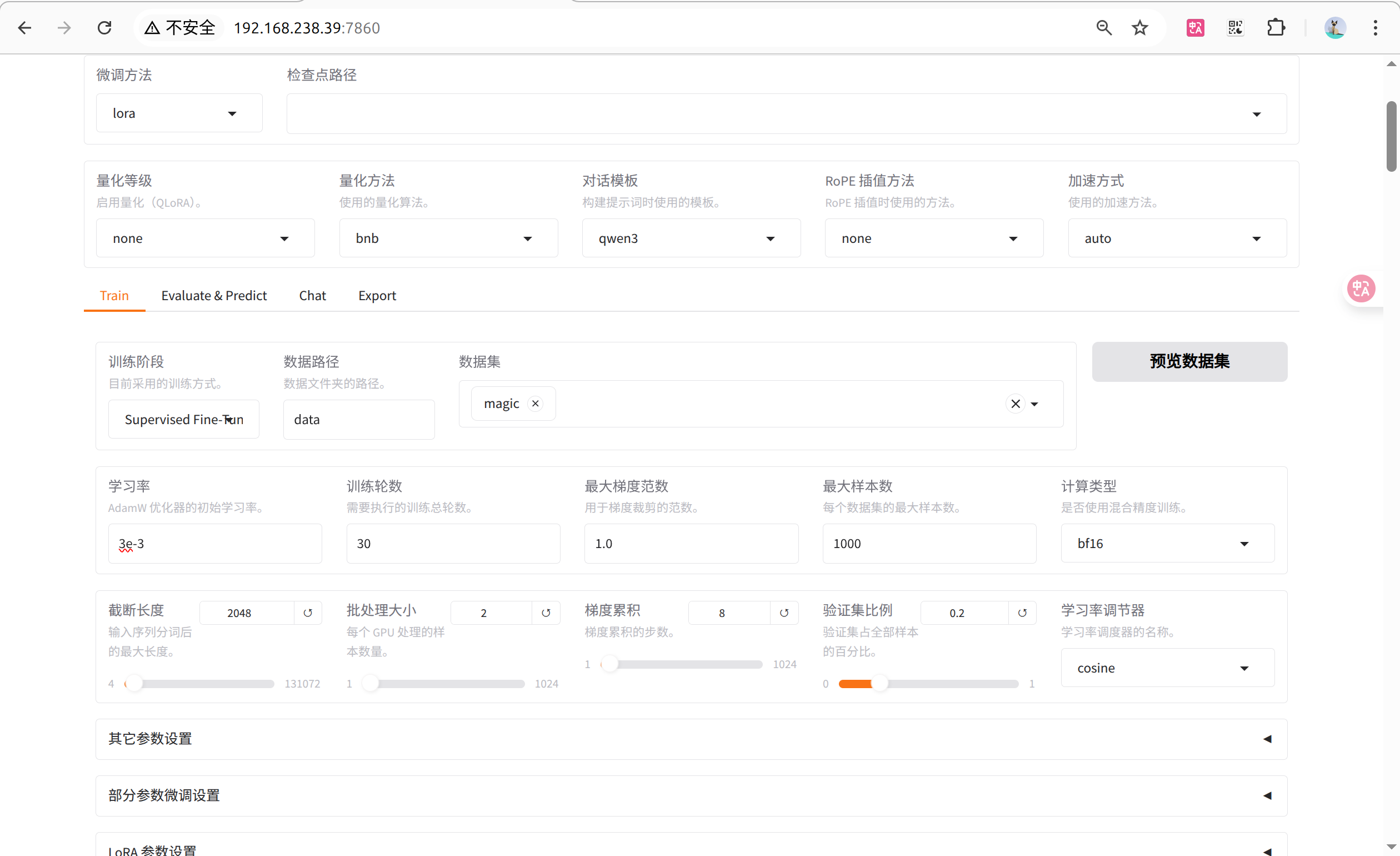LLaMA-Factory提供了简洁明了的操作界面和丰富的文档支持,使得用户能够轻松上手并快速实现模型的微调与优化。用户可以根据自己的需求选择不同的模型、算法和精度进行微调,以获得最佳的训练效果。